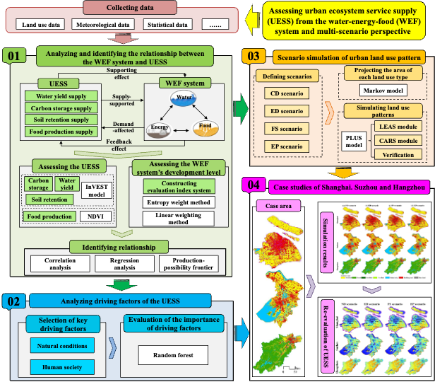 随着全球城市化进程的加速,城市已成为人类活动的主要集聚区。预计到2030年,全球约60%的人口将居住在城市地区,这将给城市自然资源和生态系统的可持续发展带来巨大压力。城市居民生存与发展所需的重要物质资源——水、能源和粮食正面临着日益严峻的短缺风险。与此同时,城市扩张和气候变化对城市生态系统也造成了显著影响,导致城市生态系统服务供给持续退化。然而,现有研究大多聚焦于水-能源-粮食系统或城市生态系统服务供给的独立评估,缺乏对二者之间互动关系的系统探讨,尤其是在多情景下的综合评估。因此,如何在考虑水-能源-粮食系统的前提下,结合未来土地利用变化情景,重新评估城市生态系统服务供给,成为实现城市自然资源与生态系统可持续管理的关键科学问题。